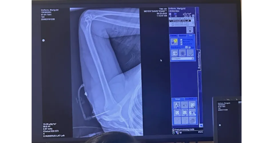 When the ambulance and police arrived, her blood pressure was at stroke level — 199/111 — and she was losing blood quickly. EMTs had to drill into her shoulder bone to start an IV and do a blood transfusion directly into her marrow to save her life. She was rushed to Memorial Hermann at the Texas Medical Center’s trauma unit, where they worked to stabilize her, get her on oxygen, and manage her extreme pain.