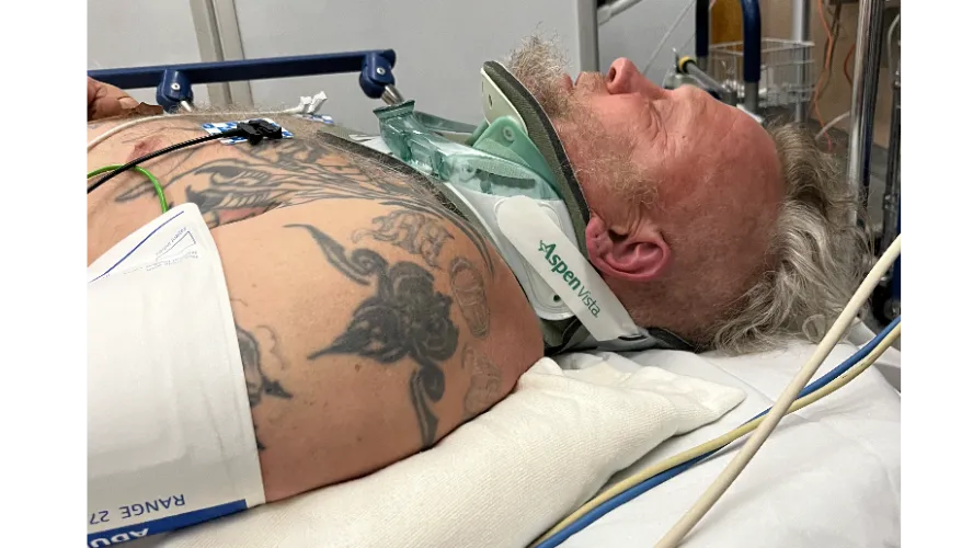 He suffered multiple serious injuries, including compression fractures in his spine and a broken neck in five places, along with fractures to his shoulder and hip, and additional pain and bruising throughout his body. He was transported by ambulance and treated at the hospital, but this is only the beginning of what will be a long road to recovery.